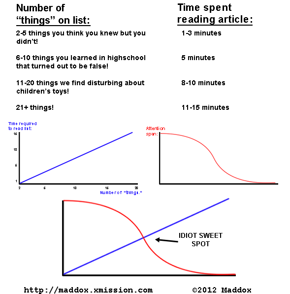 1. Find something vaguely interesting, like the eccentric habits of geniuses (Tesla, Einstein, Leonardo da Vinci), common misconceptions (wooden teeth of Washington, lemmings committing suicide, etc), or hot chicks. 2. Find several more examples of it. 3. Put it in list form, like the one you're reading now. If the list items are too long, break each item down into a sub-list. 4. Loot Wikipedia or other pop-culture magazines as much as you can. Change a few words and phrases to feign expertise and to make it your own. 5. Give the article a title with an ironic twist, e.g., "5 Things you do in the bedroom that you think are sexy, but actually aren't." or "7 Things from space that could kill you at any moment." 6. Link-bait on social networks.The reason these shitty list articles have flooded the Internet is because they're cheap, easy to generate, quick to read and require no creative work; a pig with a stick in its mouth could tap one out in morse. Marketers then disseminate these shitty list articles (or mundane infographics) by emailing influential bloggers and "suggesting" links for their readers. And here's the part that makes my heart palpitate with anger: